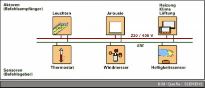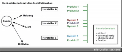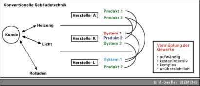 In der herkömmlichen Gebäudetechnik werden die einzelnen Anlagenteile (sog. Gewerke) wie Beleuchtung, Beschattung, Heizung, Alarmanlage, etc. separat geplant und mit verschiedenen Systemen ausgeführt.